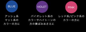色味は12種類あります。原色系の発色も良いのですがグレーやホワイトの発色が良いのでブリーチの黄ばみも消しやすいです。