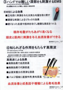 特有の光のエネルギーでお肌にダメージを与えることなく頭全体を刺激し、側頭筋・前頭筋・後頭筋に直接やさしいウェーブで頭皮を刺激することでリラックスさせ、ストレスからくるトラブルを回避しやすくさせ健康な髪の毛が育つようになる、発毛をサポートします。